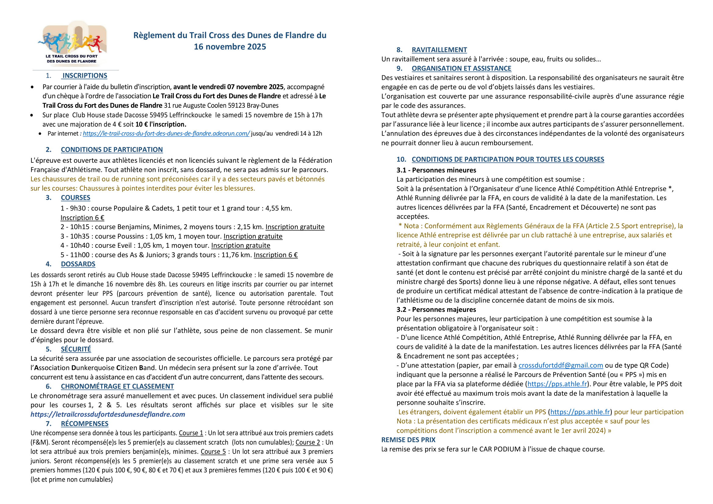 '' Retrouvez dans cette section toutes les informations utiles pour participer au Trail Cross du Fort des Dunes de Flandre. Vous y découvrirez le règlement détaillé de l’événement, les démarches à suivre pour vous inscrire, ainsi qu’une présentation de nos partenaires qui contribuent à la réussite de cette édition. Que vous soyez coureur, marcheur ou spectateur, préparez-vous à vivre une expérience sportive inoubliable dans un cadre exceptionnel. ''